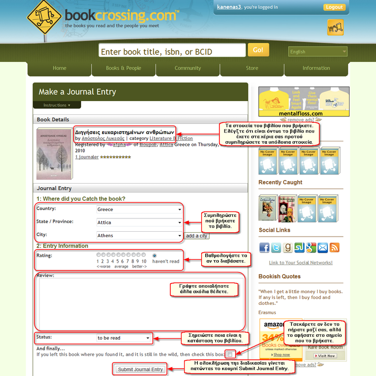 Αν είστε μέλος, μην ξεχάσετε πρώτα να συνδεθείτε με το λογαριασμό που έχετε στο www.bookcrossing.com, ώστε να αναγνωριστείτε και το βιβλίο να τοποθετηθεί στο bookshelf σας.