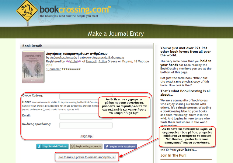Τότε θα μεταφερθείτε σε μια σελίδα που εμφανίζει τα βασικά στοιχεία του βιβλίου, και στην οποία σάς προτείνεται να εγγραφείτε μέλος στο www.bookcrossing.com προτού συνεχίσετε. Αν εκείνη τη στιγμή δεν θέλετε να εγγραφείτε μέλος, μπορείτε απλώς να πατήσετε το κουμπί No thanks, I prefer to remain anonymous και να συνεχίσετε.