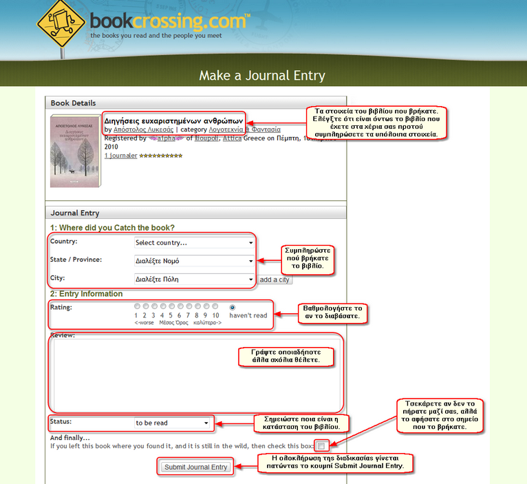 Τότε θα μεταφερθείτε στη σελίδα που θα εμφανίζει τα στοιχεία του βιβλίου και στην οποία θα πρέπει να συμπληρώσετε πού βρήκατε το βιβλίο, ποια η βαθμολογία του (αν το διαβάσατε ήδη), τι σχόλια έχετε να κάνετε, ποια είναι η τωρινή κατάσταση του βιβλίου, και αν το αφήσατε στο σημείο που το βρήκατε χωρίς να το πάρετε μαζί σας).