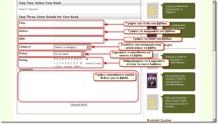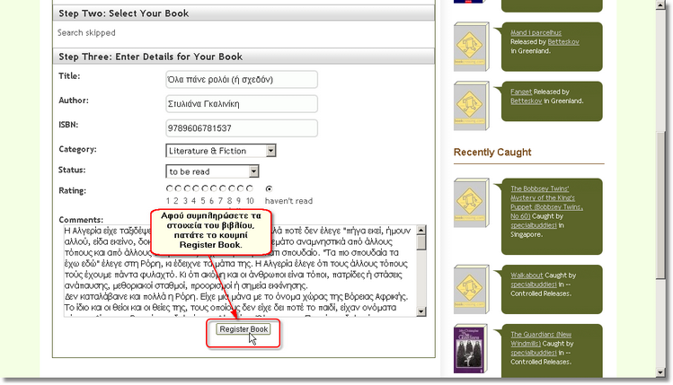 Έχετε ένα βιβλίο που δεν έχει BCID (δεν είναι δηλαδή καταχωρισμένο στο www.bookcrossing.com) και θέλετε να το καταχωρίσετε ώστε να αρχίσει να ταξιδεύει και να μαθαίνετε τα νέα του;