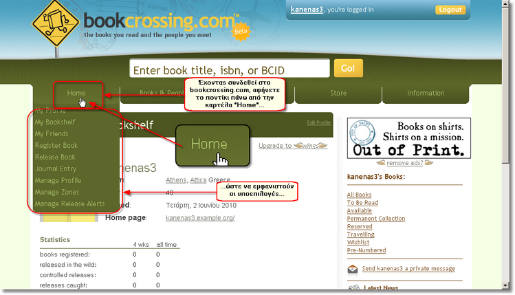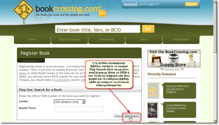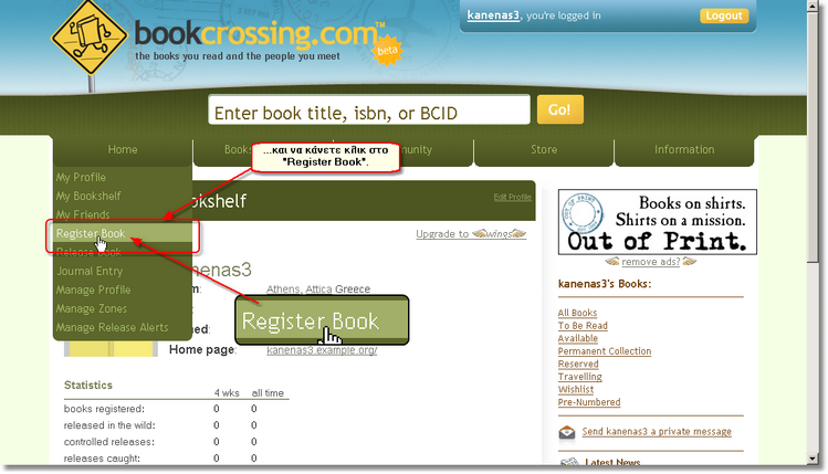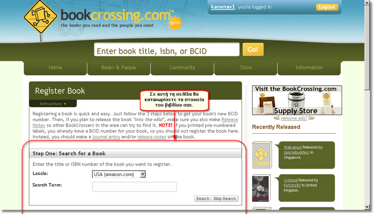 Για να καταχωρίσετε ένα βιβλίο στο www.bookcrossing.com, πρέπει πρώτα-πρώτα να συνδεθείτε με το λογαριασμό που έχετε στο www.bookcrossing.com, ώστε να αναγνωριστείτε ως χρήστης και το βιβλίο που θα καταχωρίσετε να τοποθετηθεί στο ράφι σας.