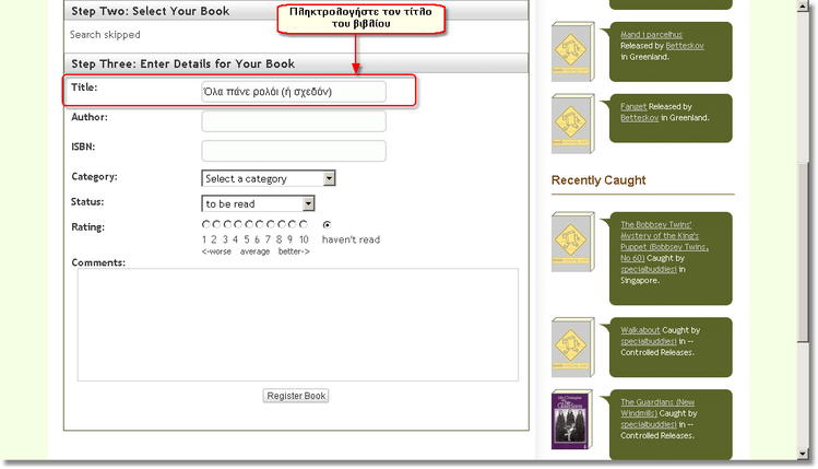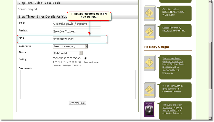 Η καταχώριση των στοιχείων του βιβλίου μπορεί να γίνει είτε αυτόματα με τη χρήση του ISBN (μόνο αν έχει ήδη καταχωρισθεί σε κάποιο από τα site που συμβουλεύεται το www.bookcrossing.com, κυρίως τα amazon), είτε με την πληκτρολόγηση (ο τρόπος που εκτός θαυμάτων θα χρησιμοποιείτε για τα ελληνικά βιβλία) όπως θα παρουσιαστεί στη συνέχεια.