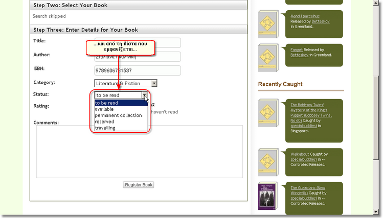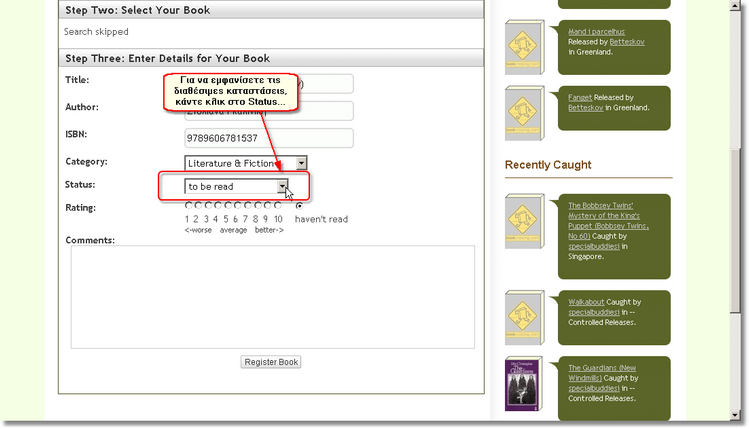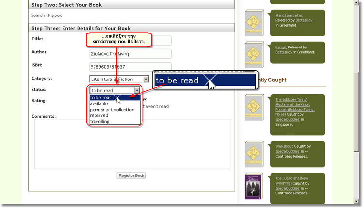 Στη συνέχεια μπορείτε να σημειώσετε σε τι κατάσταση βρίσκεται το βιβλίο. Όχι, δε θα σημειώσετε αν είναι ολοκαίνουριο ή παλιό και σχισμένο (αν θέλατε θα μπορούσατε να το σημειώσετε στα σχόλια!), αλλά την... ταξιδιωτική του κατάσταση. Η προεπιλεγμένη κατάσταση είναι to be read (προς ανάγνωση), αλλά μπορείτε εύκολα να επιλέξετε κάποια άλλη.