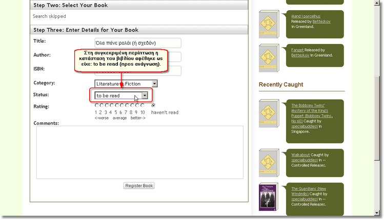 Για το βιβλίο του παραδείγματος η κατάσταση αφέθηκε ως είχε: to be read (προς ανάγνωση).