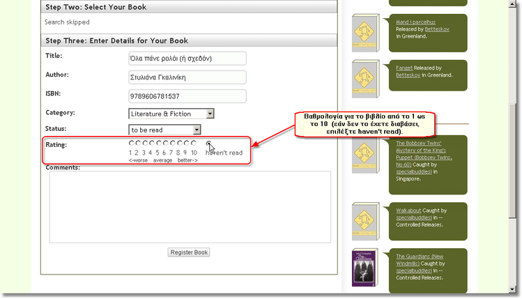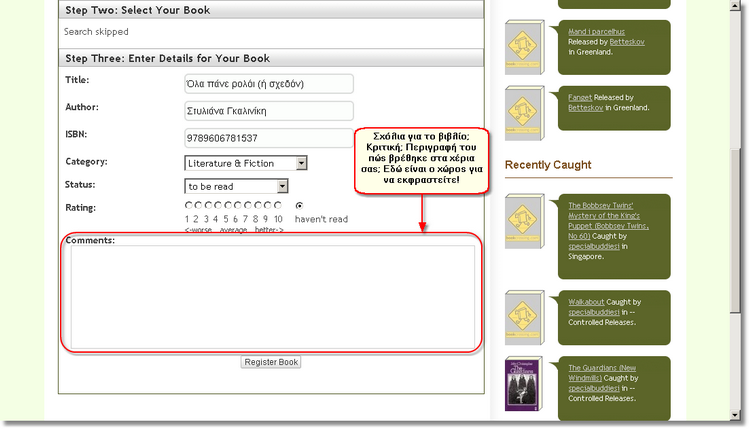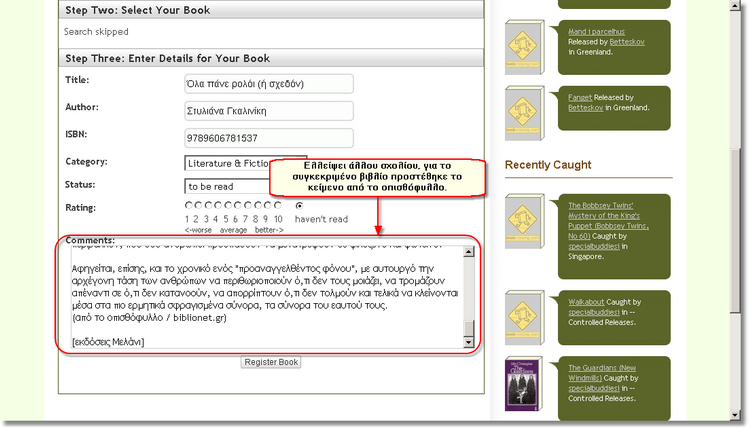 Αμέσως μετά τη βαθμολογία, υπάρχει χώρος για να γράψετε σχόλια για το βιβλίο.