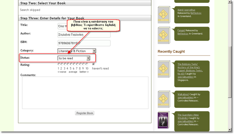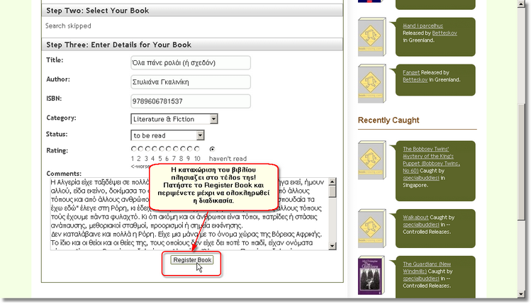 Πλησιάζετε στη μεγάλη στιγμή, στην ολοκλήρωση της καταχώρισης του βιβλίου στο www.bookcrossing.com! Αφού έχετε βεβαιωθεί ότι όλα είναι όπως τα θέλετε, ήρθε η στιγμή της ολοκλήρωσης της καταχώρισης!
