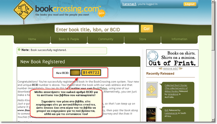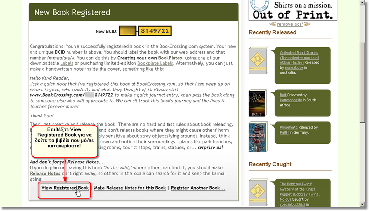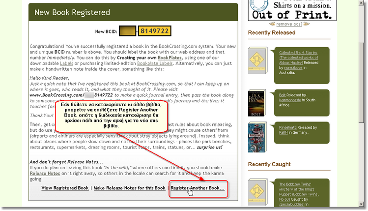 Αφού περάσουν τα δευτερόλεπτα αναμονής που αναλογούν σε κάθε αξιοπρεπή bookcrosser κατά την καταχώριση, το www.bookcrossing.com σας ανταμοίβει με τον ένα και μοναδικό κωδικό αριθμό BCID (BookCrossing ID) που αντιστοιχεί στο συγκεκριμένο αντίτυπο του βιβλίου. Συγχαρητήρια, το βιβλίο σας καταχωρίστηκε στο www.bookcrossing.com!