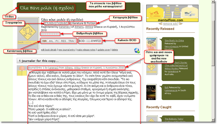 ●travelling (TRAV): το βιβλίο ταξιδεύει! Αυτό το βιβλίο έχει απελευθερωθεί από το συγκεκριμένο χρήστη και δεν έχουν μαθευτεί ακόμα στοιχεία για το πού βρίσκεται.
