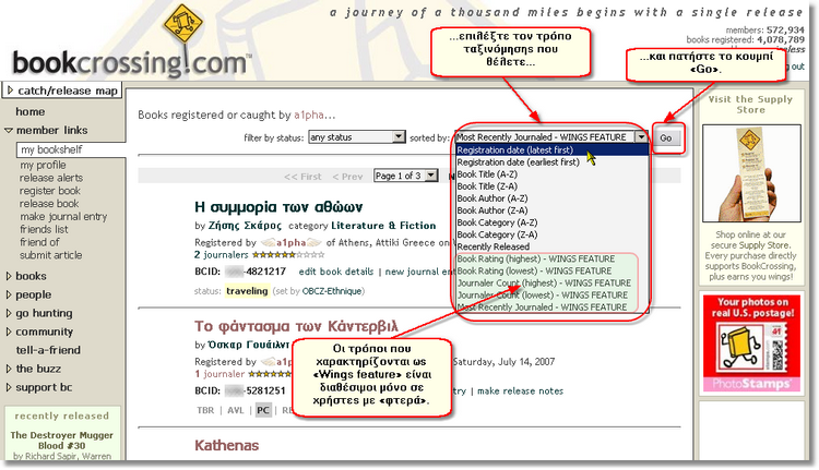 Αν θέλετε να αλλάξετε τον τρόπο με τον οποίο εμφανίζονται ταξινομημένα τα βιβλία, τότε κάνετε κλικ στο πεδίο «sorted by», επιλέγετε τον τρόπο ταξινόμησης και στη συνέχεια κάνετε κλικ στο κουμπί «Go». Σε περίπτωση που έχετε φτερά, εμφανίζονται επιπλέον τρόποι ταξινόμησης, οι οποίοι ξεχωρίζουν από τους υπόλοιπους χαρακτηριζόμενοι ως «wings feature».