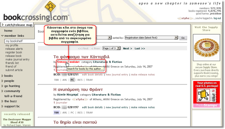 Αν κάνετε κλικ στο όνομα ενός συγγραφέα, θα βρείτε τα βιβλία του συγκεκριμένου συγγραφέα που είναι καταχωρισμένα στο www.bookcrossing.com· ακριβέστερα, θα προσπαθήσετε να βρείτε βιβλία του συγκεκριμένου συγγραφέα. Για ονόματα στα λατινικά φαίνεται να δουλεύει, για ονόματα σε ελληνικά όμως, πρέπει να έχετε και λίγη τύχη...
