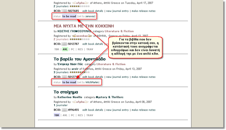 Μπορείτε να αλλάξετε την κατάσταση στην οποία βρίσκεται κάθε βιβλίο που έχετε στην κατοχή σας, κάνοντας κλικ στη συντομογραφία που συμβολίζει την επιθυμητή κατάσταση.