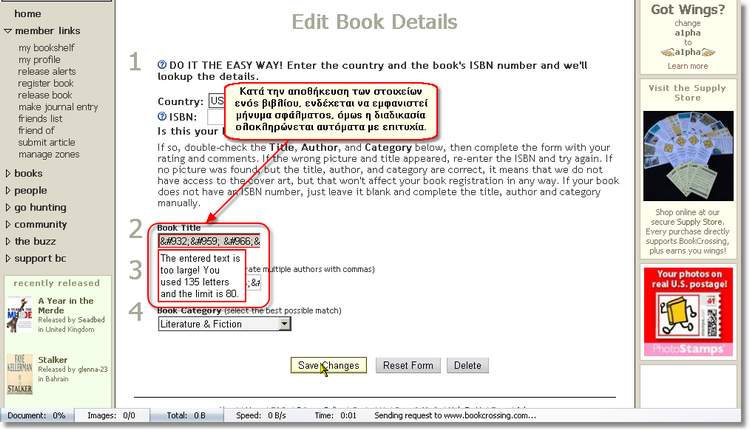 Σημείωση: αν κατά την αποθήκευση των στοιχείων ενός βιβλίου υπάρχουν αυτά τα ακαταλαβίστικα της μορφής { αντί για ελληνικά σε κάποιο από τα πεδία (αν λ.χ. δεν αλλάξατε τα στοιχεία του πεδίου), ενδέχεται να εμφανιστεί μήνυμα σφάλματος, όμως η αποθήκευση συνεχίζεται αυτόματα και ολοκληρώνεται επιτυχώς.