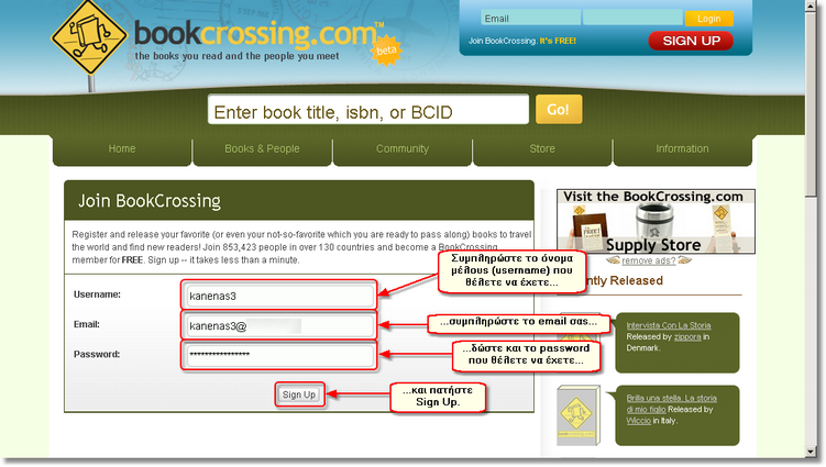 Για να γίνετε μέλη στο bookcrossing: πηγαίνετε στην αρχική σελίδα (www.bookcrossing.com) και επιλέγετε Sign Up: