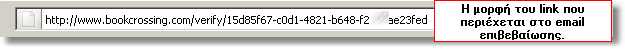 Προσοχή! Για να ολοκληρωθεί πλήρως η διαδικασία της εγγραφής σας (και να μπορείτε να ξανασυνδεθείτε αν αποσυνδεθείτε) θα πρέπει να αποδείξετε πως σας ανήκει το email που δηλώσατε. Για το λόγο αυτό, το www.bookcrossing.com έχει στείλει αυτόματα ένα μήνυμα στον εν λόγω λογαριασμό email, το οποίο πρέπει να ελέγξετε.